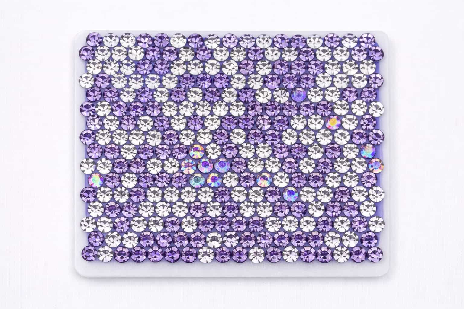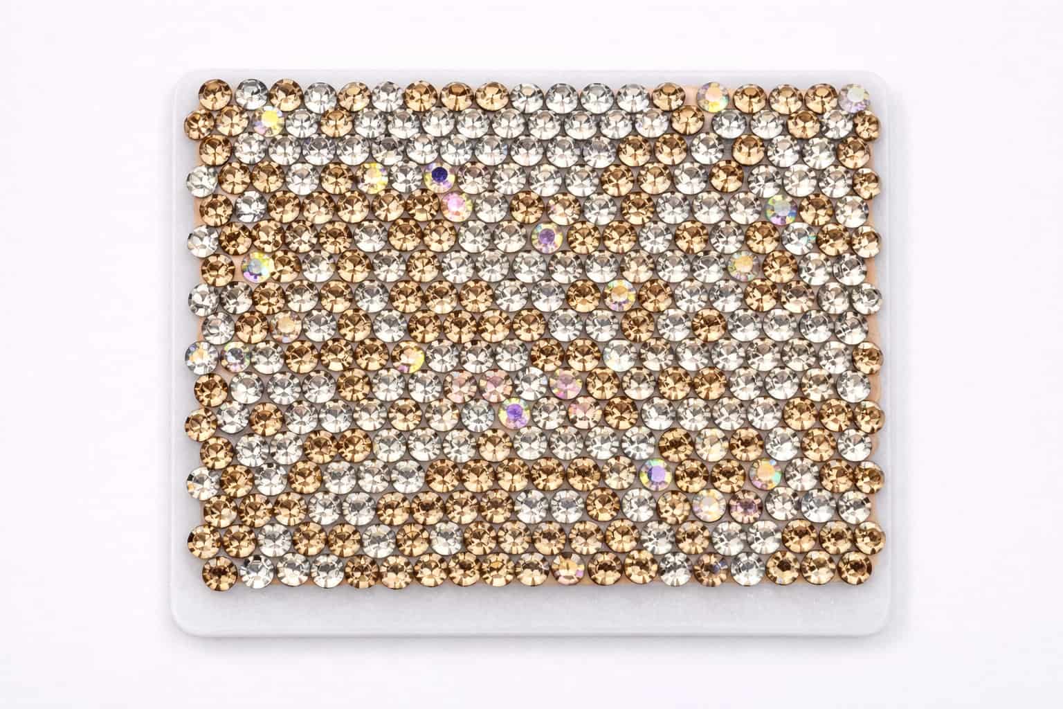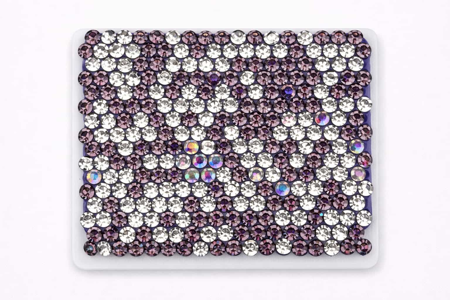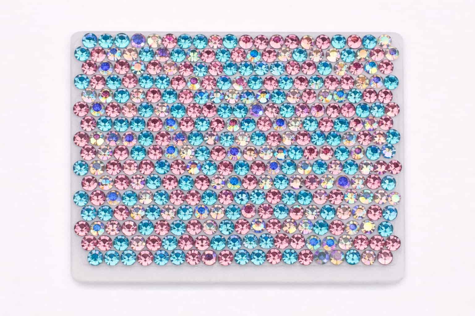 The samples below showcase a range of rhinestone colors and mixed patterns we have previously manufactured. Color references, custom mixes, or new pattern requests can be developed based on your design needs and order volume.